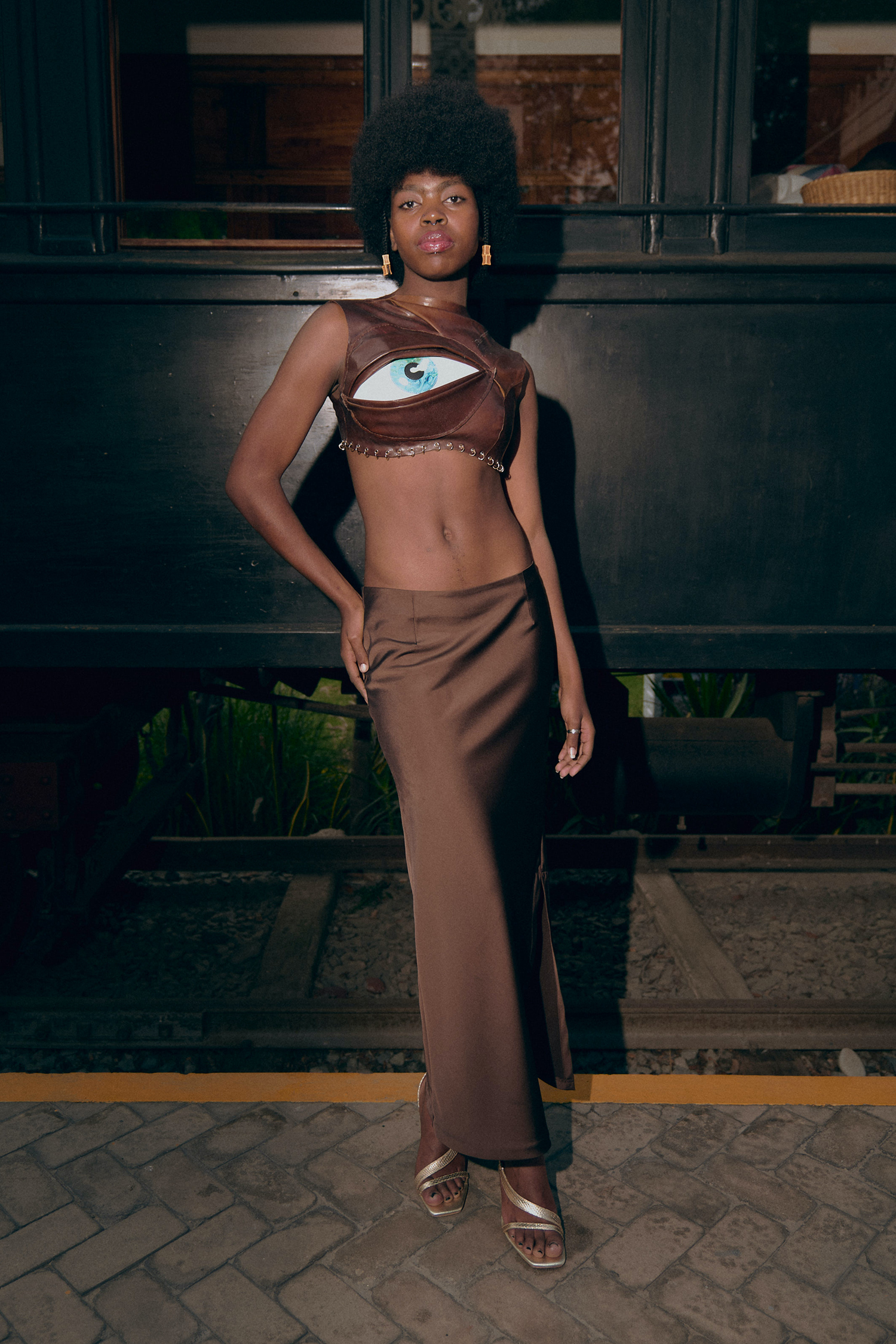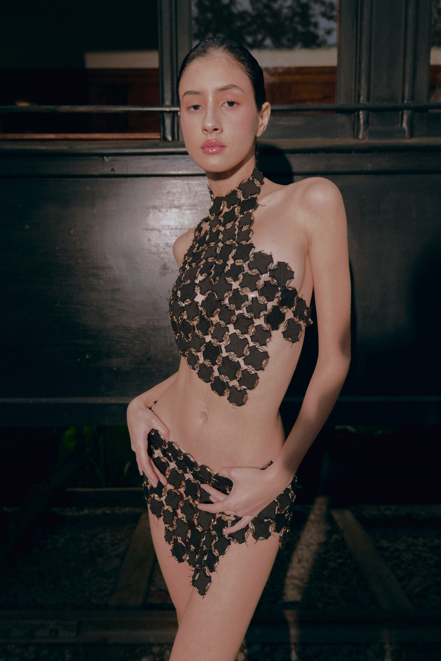 La colección ARTE-SANA 2024, es un relato nacido de la sanación y la visión interior. Su origen se encuentra en ceremonias de Ayahuasca, donde las visiones de la Pachamama y el círculo de la vida revelan a la mujer como fuerza guerrera y luminosa. Esa búsqueda espiritual se traduce en un escenario de guerreros futuristas, donde cada prenda se convierte en un amuleto que acompaña el viaje hacia el interior. La colección reúne 20 piezas trabajadas artesanalmente con cuero vegano de shiringa, metales y denim. El cuero de shiringa, extraído de manera sostenible en la Amazonía de Madre de Dios, aparece como material protagónico: vivo, flexible y portador de memoria ancestral. Su textura se entrelaza con intervenciones pintadas a mano y con procesos de upcycling que reafirman la voluntad de diseñar con propósito y respeto por la tierra. El resultado es un lenguaje estético donde lo natural y lo tecnológico conviven en tensión armónica: blazers estructurados, cuerpos revestidos de metal, texturas orgánicas y superficies que evocan armaduras rituales. Cada pieza manifiesta la fortaleza femenina como una energía que se expande, sana y transforma. ARTE-SANA no es solo una colección, sino un proceso: un puente entre la tierra y el futuro, entre la herida y la sanación, entre el cuerpo y el espíritu.
