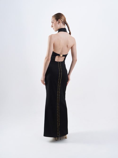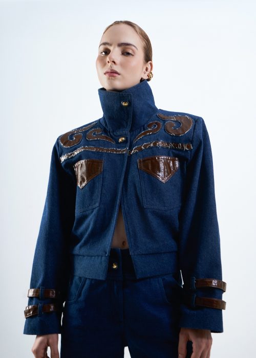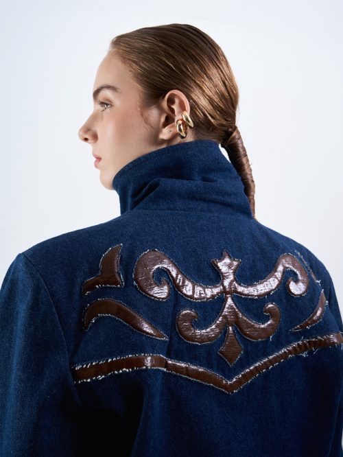 Estos pantalones rectos de tiro medio están confeccionado en denim azul oscuro 100% algodón con un corte en las rodillas y detalles metálicos dorados.