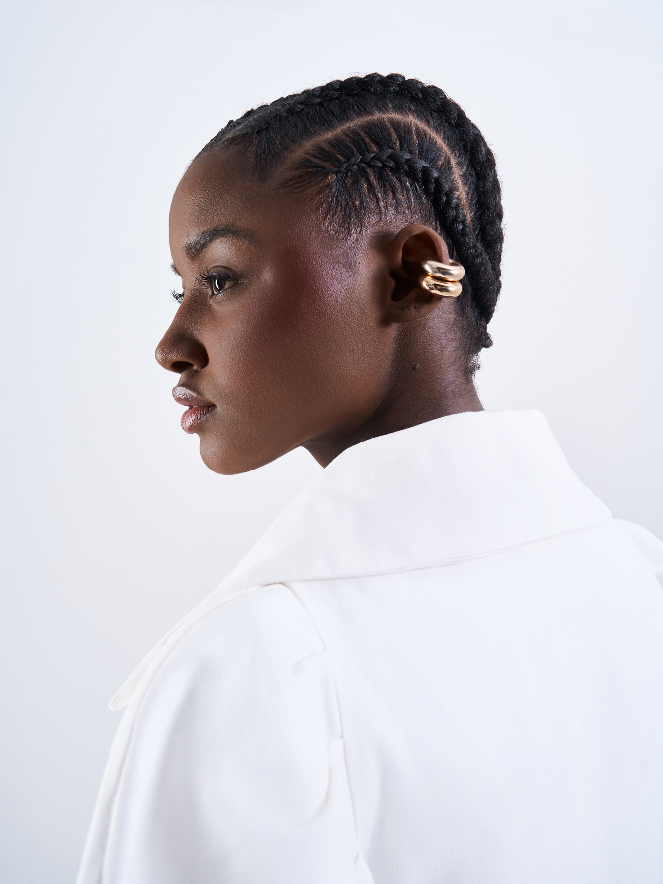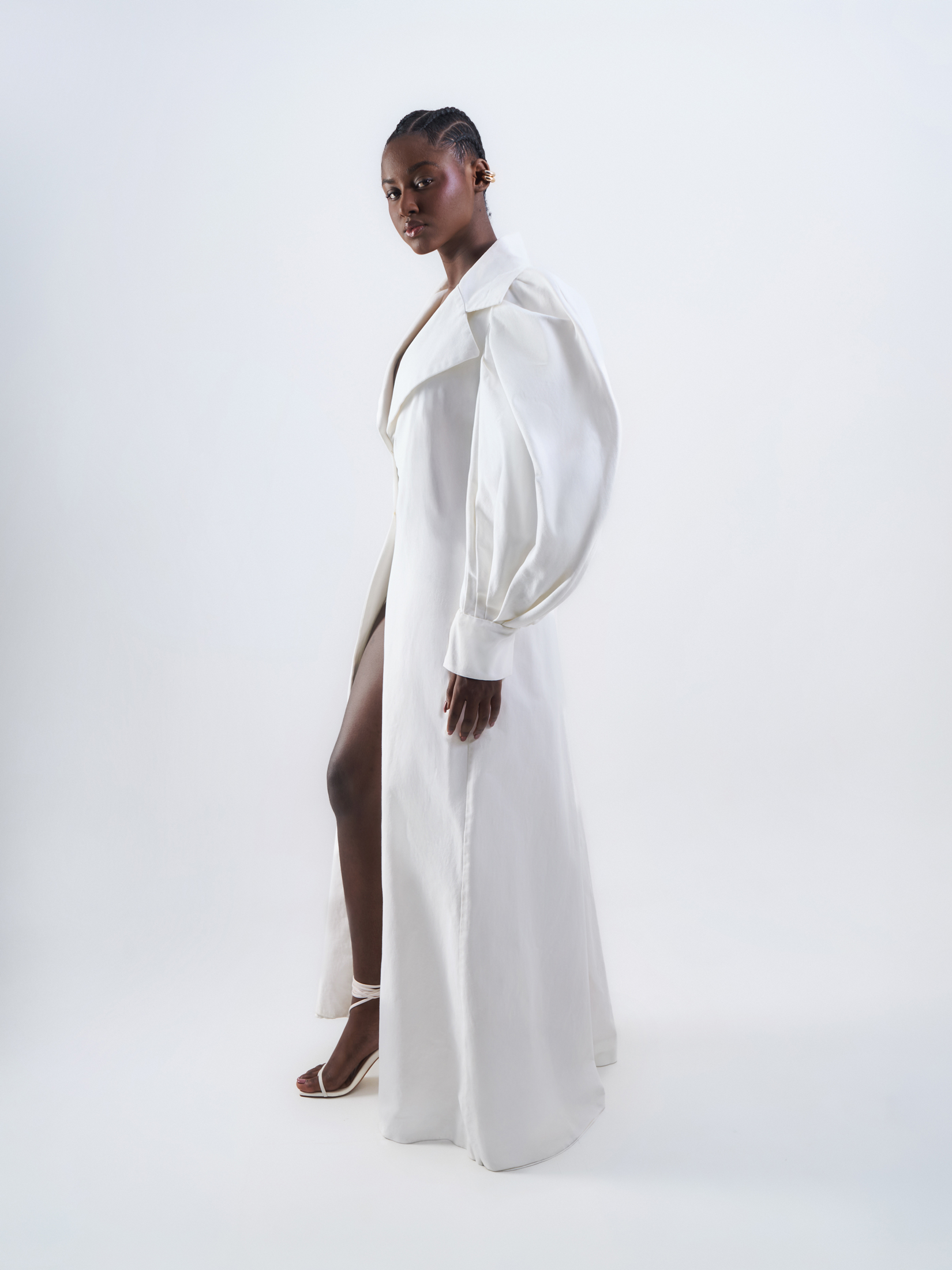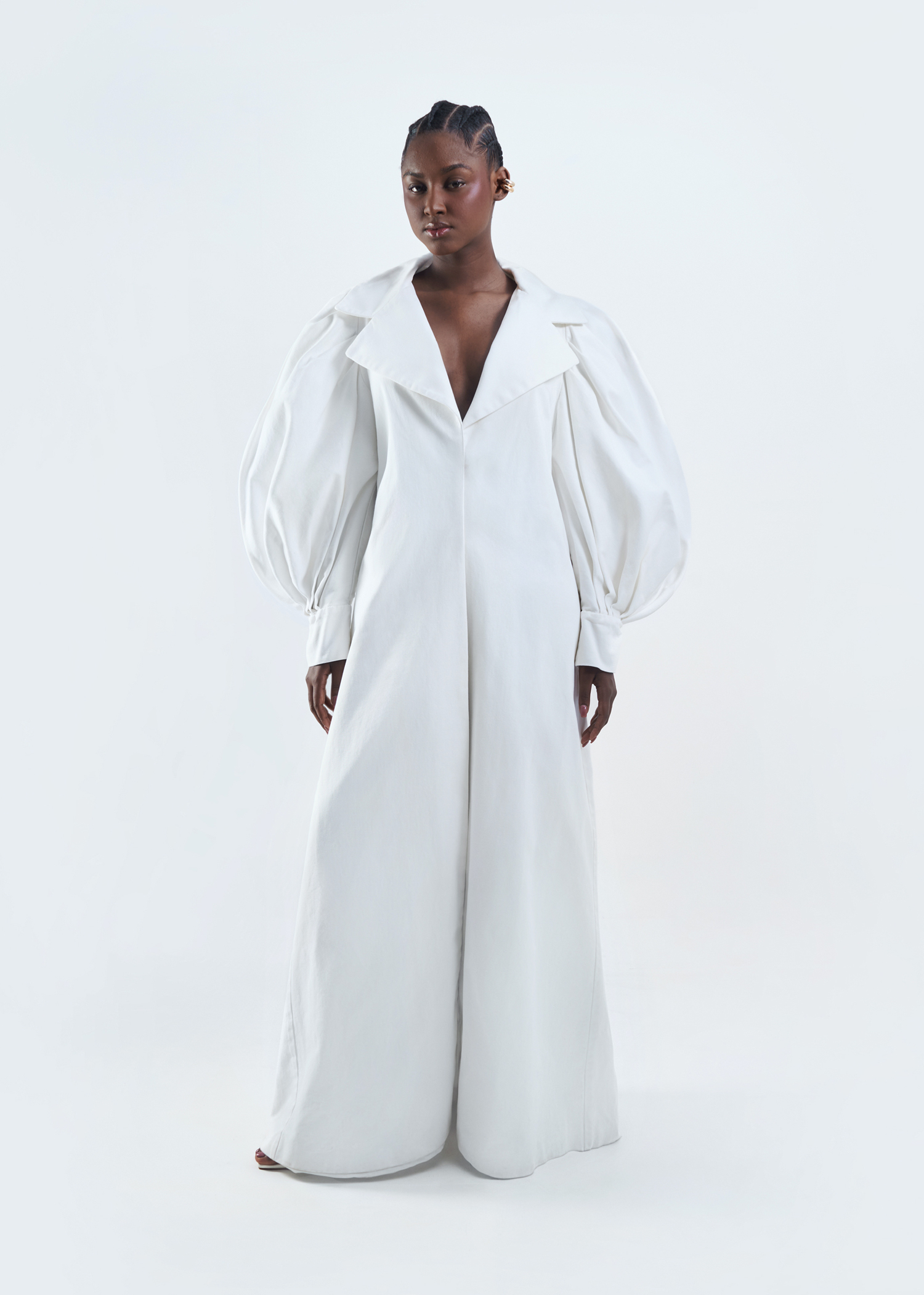 Este abrigo largo con mangas abullonadas y una imponente estructurada está confeccionada en denim blanco 100% algodón. Forrado en seda y acabados a mano.
