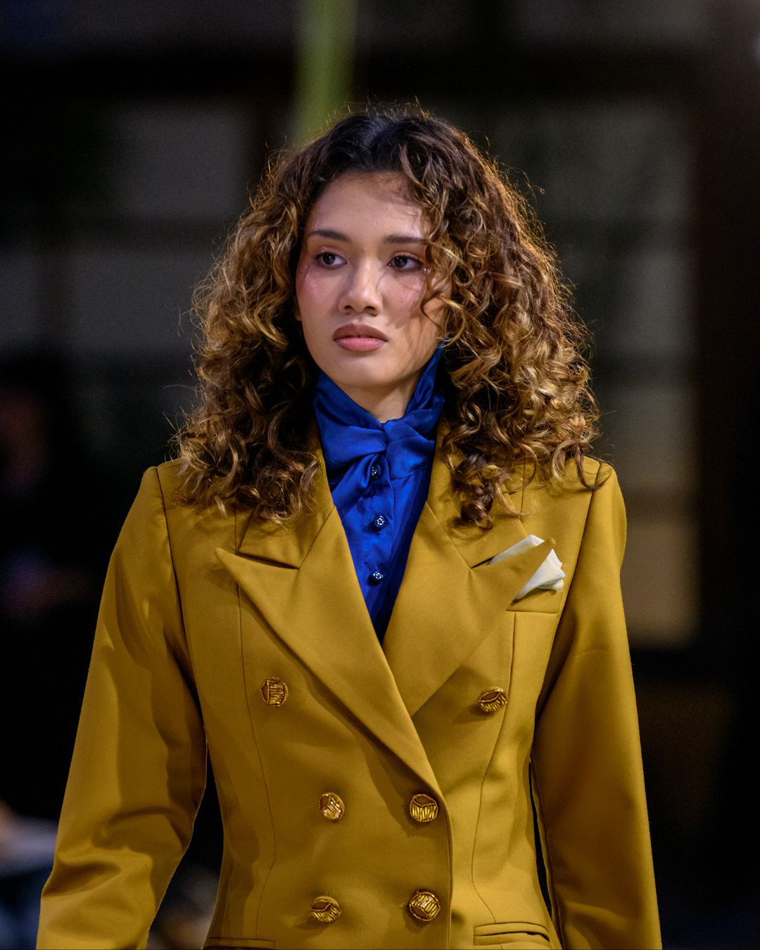This handcrafted top is made from 100% cotton white denim. It features hand-sewn crosses in recycled denim and gold-tone metal rings, attached at the front.